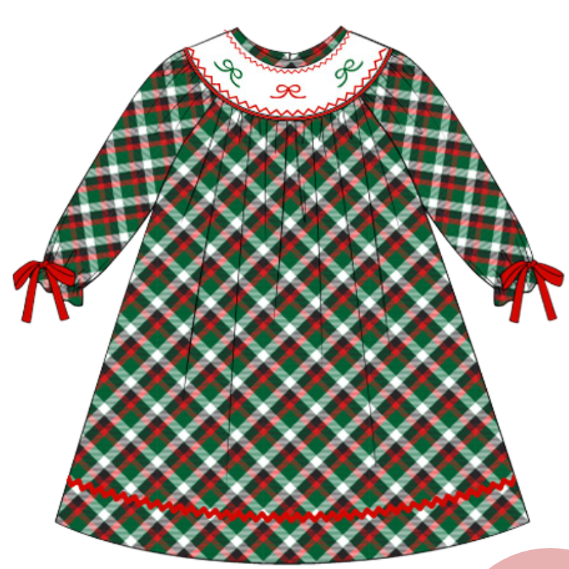 This custom smocked green plaid dress is perfect for creating all those holiday memories! There are three bows smocked across the smock plate collar of the dress. There is a red bow detail on each wrist.